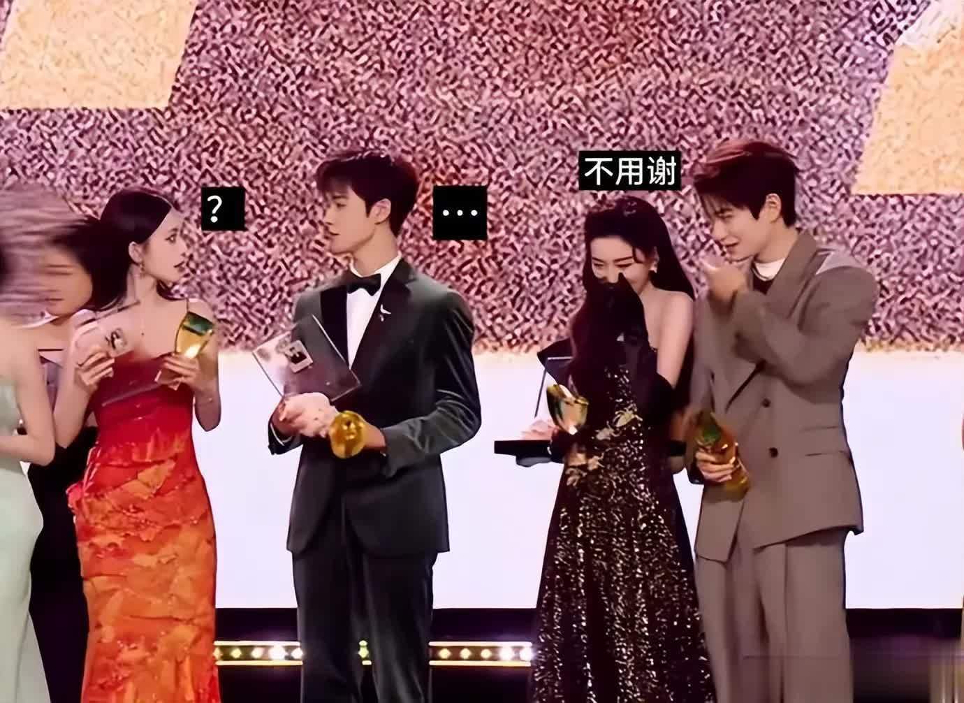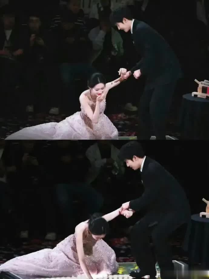 同台的白鹿惊呼捂嘴,丞磊转身试图协助,四人最终手拉手并排行进下台。台下丁禹兮因惊吓隔空伸手“抢救”,动作幅度惊动邻座鞠婧祎,形成反差喜剧效果。