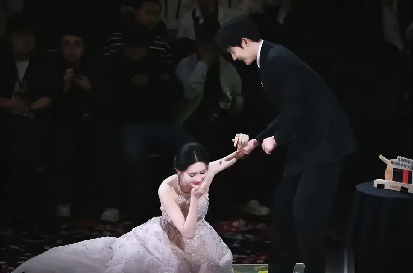 在2025年12月21日的腾讯星光大赏颁奖礼上,孟子义作为《尚公主》剧组代表登台领取“最受期待剧集奖”时,因10厘米高跟鞋踩到三米长的鎏金鱼尾裙摆失衡摔倒,双膝跪地磕在台阶上。